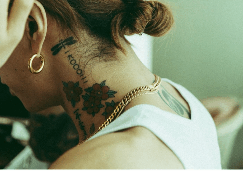 首は「一斗二升五合」以外にも花のタトゥーとトンボのタトゥーが彫られています。