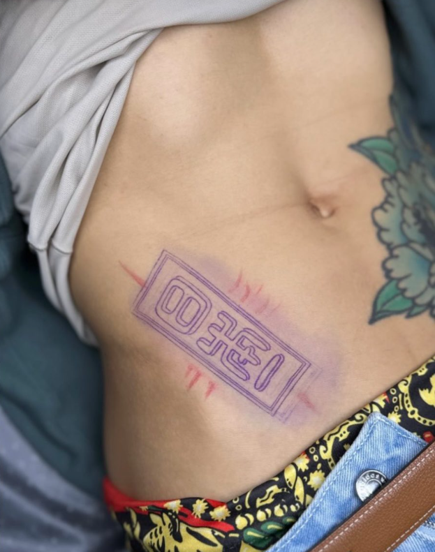 脇腹には鮮やかな牡丹の花のタトゥーが施されています。牡丹は「花の王」と呼ばれるほど豪華で気品があり、古来より“富と地位の象徴”とされていました。また、武士の刺青にも多く使われ、「華の中に力を秘めた存在」として尊ばれたそうです。