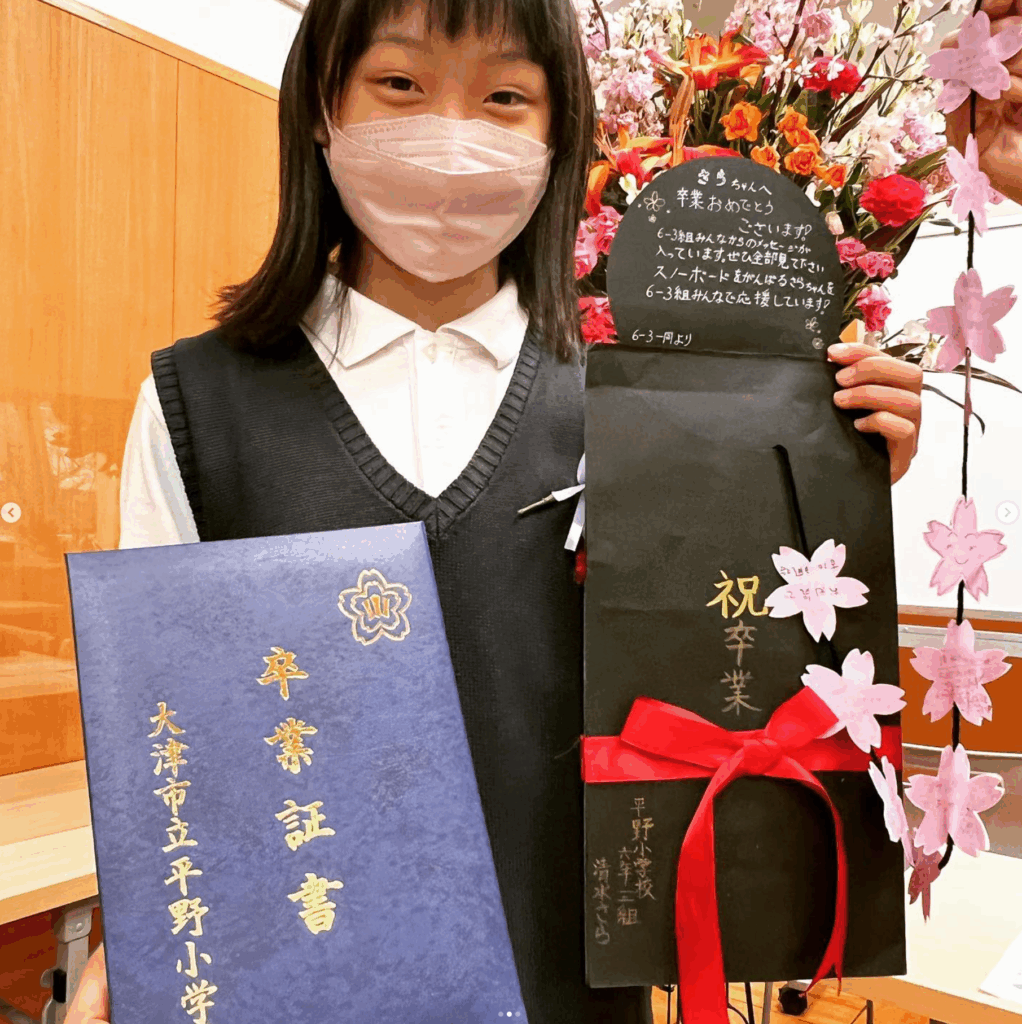 清水さらさんは、滋賀県大津市竜が丘保育園を卒園し、2016年から滋賀県大津市立平野小学校に通い、2022年に卒業しています。