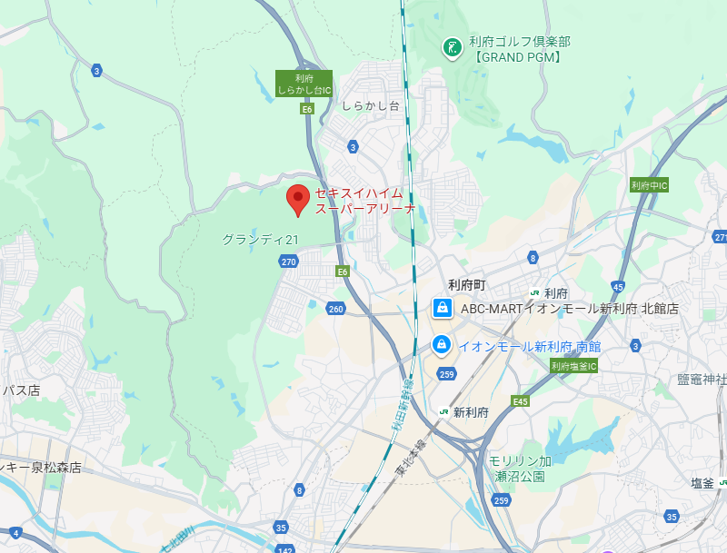 アクセス:東北本線「利府駅」からバスで約10分「菅谷台4丁目」下車 。(利府駅からセキスイハイムスーパーアリーナまでのタクシー料金は約1,500円)