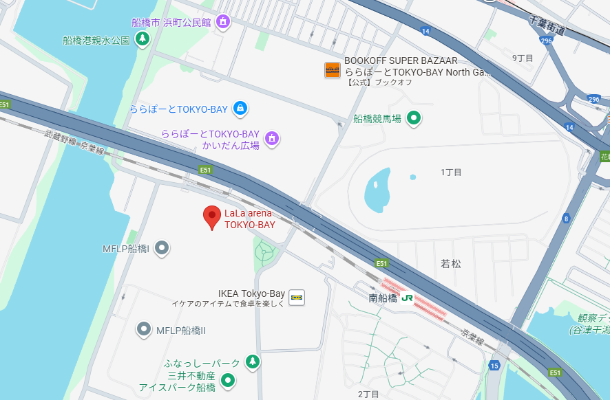 アクセス:南船橋駅 (JR京葉線、武蔵野線)より徒歩6分、船橋競馬場駅(京成本線)より徒歩16分